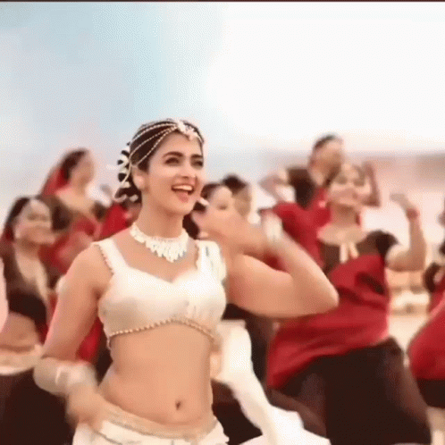 Pooja Hegde, the exotic beauty diva, dancing energetically in a white traditional outfit.
