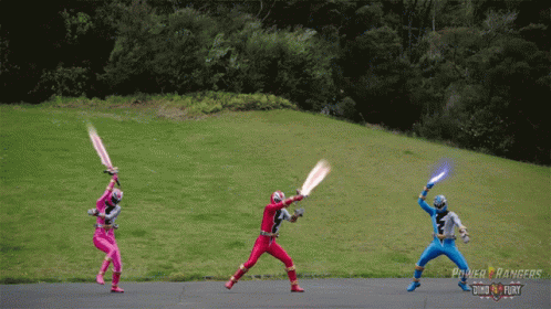 Zayto, the Red Dino Fury Ranger, with Pink and Blue Rangers, unleashes colorful explosions in a fighting stance.