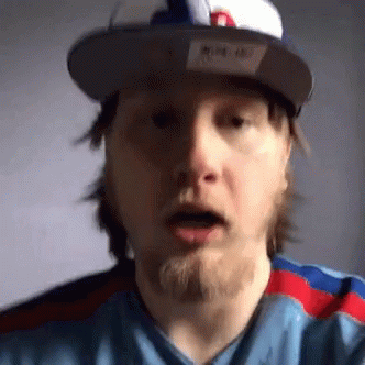 A man wearing a Montreal Expos baseball cap and jersey, appearing to talk or react.