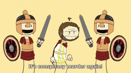 A cartoon from Extra Credits depicts a man surrounded by Roman soldiers, exclaiming 'It's conspiracy murder again!'