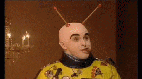 Extra Rbo, a man with a bald head and antennae, wearing a yellow costume and making a funny face.