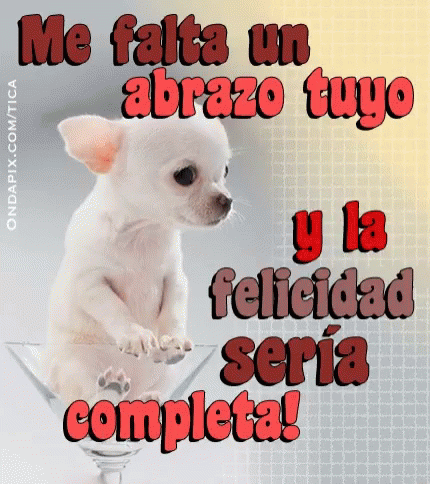 A chihuahua puppy sits in a martini glass, expressing longing with the words 'me falta un abrazo tuyo'.