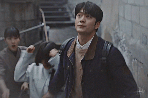 Lee Jun Ho protects Woo Young Woo and another person in a tense alleyway scene from Extraordinary Attorney Woo.