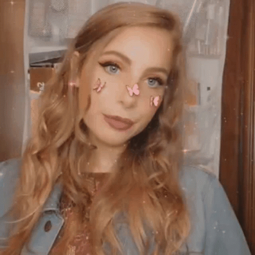 A young woman with ginger hair playfully rolls her eyes while wearing a butterfly face filter.