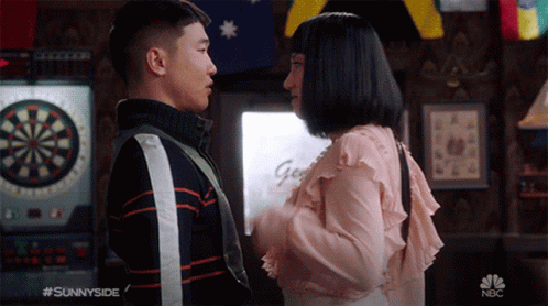Joel Kim Booster and Poppy Liu share an intense eye-to-eye moment in a bar setting, with a dartboard in the background.