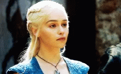 Emilia Clarke, with blonde hair and a blue dress, delivers a subtle eyeroll in Game of Thrones.