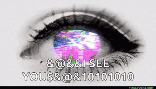 A close-up of a woman's eye blinking, with the text '&&&I SEE YOU$&&&10101010' displayed below it.