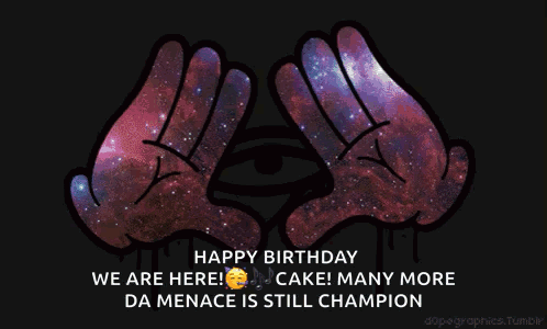 Two hands forming an Illuminati triangle with a galaxy pattern that changes from green to purple, featuring a birthday message.