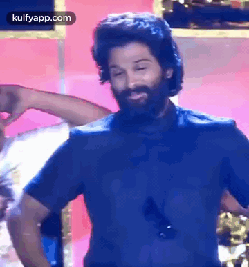 Allu Arjun performs a dance step from 'Eyy Bidda Ye Mera Adda' on stage, looking stylish in a blue shirt.