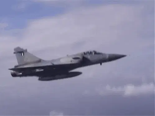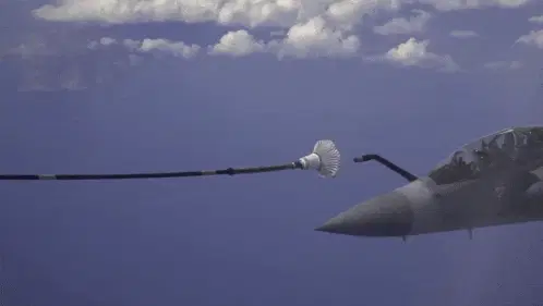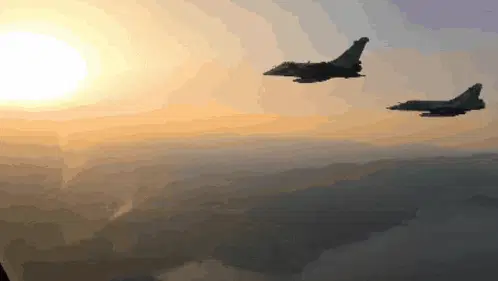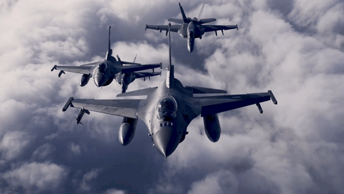 Three F-16 and F-18 fighter jets fly in a tight formation above a sea of clouds.