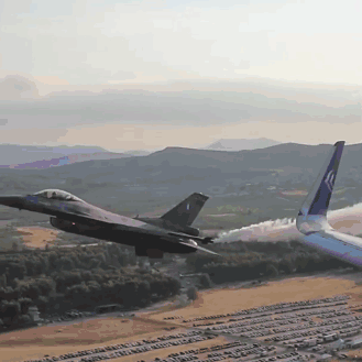 An F-16 fighter jet performs a low-speed pass, emitting smoke, alongside an Airbus A320 airliner over a scenic landscape.