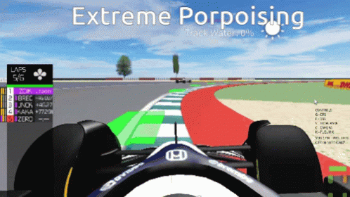 Experience extreme porpoising in an F1 racing game on Roblox, showing lap progress and track water percentage.