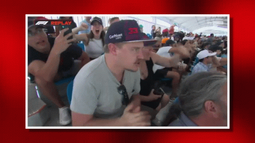Excited fan in a Red Bull hat reacting intensely at the F1 Miami Grand Prix.