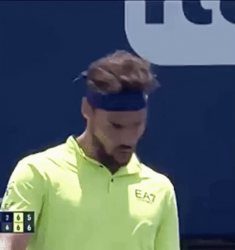 Tennis player Fabio Fognini reacts on court, wearing a neon yellow shirt and purple headband.