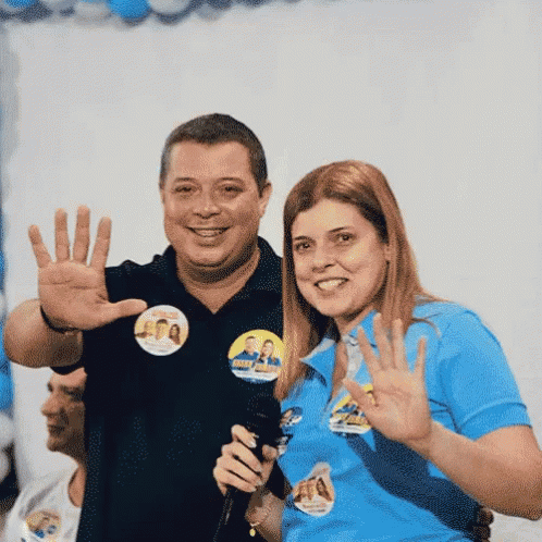 Fabio Mitidieri and Maisa Mitidieri smiling and waving at a political event, with '55' overlays.