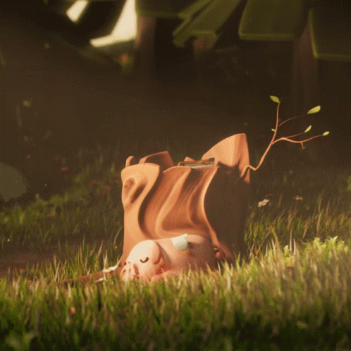 A cute Fabledom pig with wings wakes up from a nap next to a tree stump and flies away into the forest.