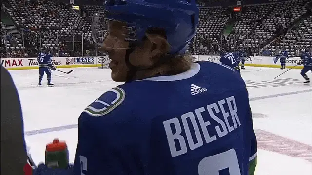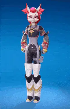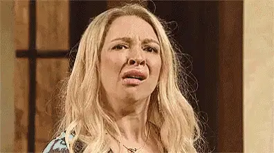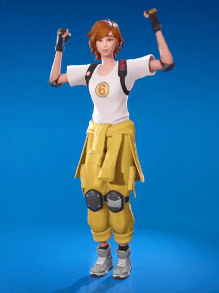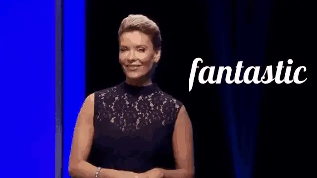 Smiling woman in a vibrant red top with green and gold trim, looking directly at the camera in a dimly lit outdoor setting.