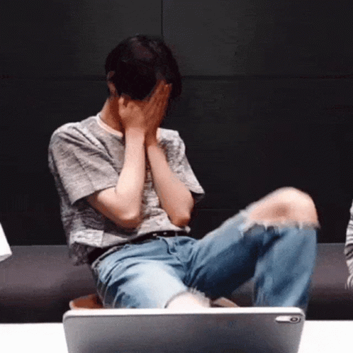 Yeonjun's embarrassed facepalm reaction while sitting, then looking up and rubbing his hands.