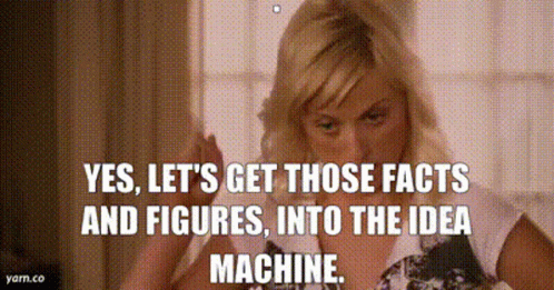 Woman enthusiastically declares, 'Yes, let's get those facts and figures, into the idea machine.'