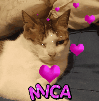 Facugpj Facumica, a charming cat, lies on a bed surrounded by animated hearts and sparkles, with 'MICA' text.