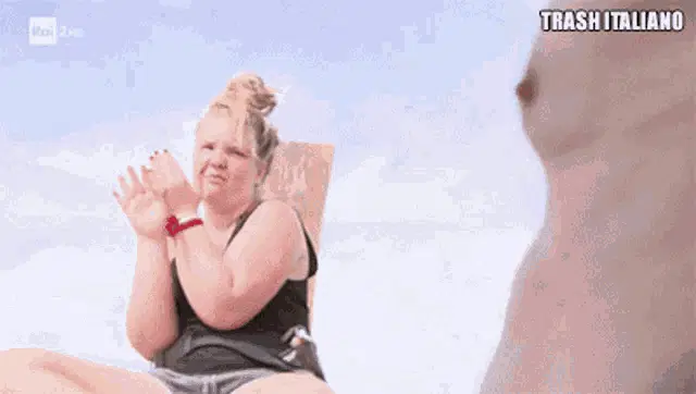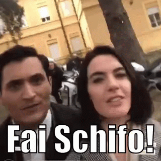 A man and a woman, possibly conti and clelia from Il Paradiso Delle Signore, react with 'Fai Schifo!' (You're disgusting!).
