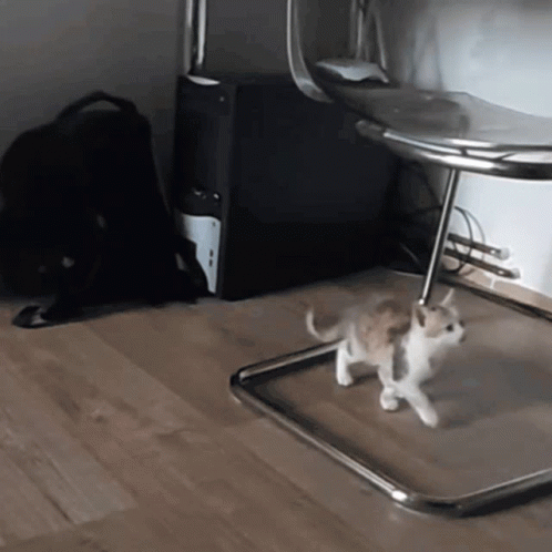 A cute kitten, Kocka, has a funny moment on the wooden floor, looking around and then lying down playfully.