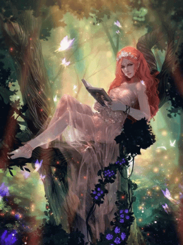 Fairy Fada, a red-haired woman in a flowing dress, reads a book while perched on a tree branch in a magical forest.
