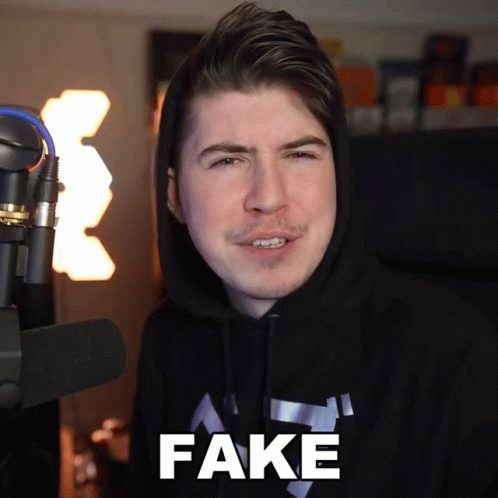 Pierce Kavanagh, wearing a black hoodie, looks at the camera with the word 'FAKE' superimposed on the screen.