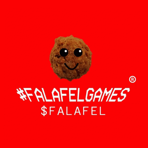 A smiling falafel character with #FALAFELGAMES and $FALAFEL text on a vibrant red background, representing the crypto project.