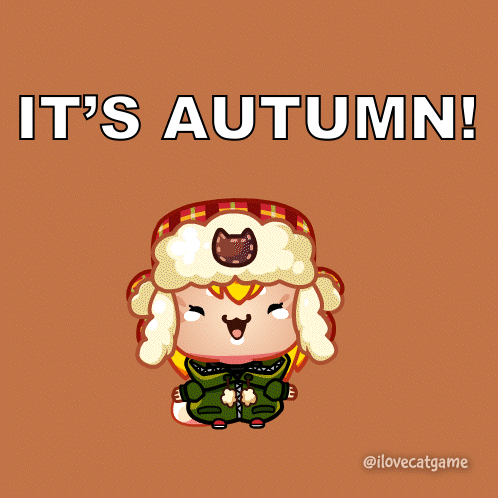 A cute animated character from ilovecatgame celebrates the arrival of autumn, wearing a cozy hat and coat.