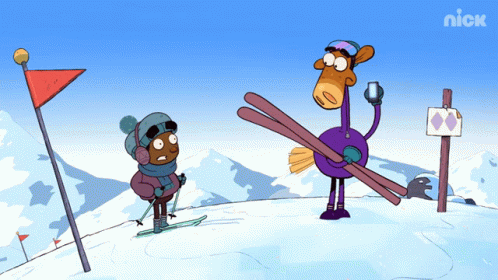 Pony Bramley and a friend prepare for a downhill ski run on a snowy mountain in this animated clip.
