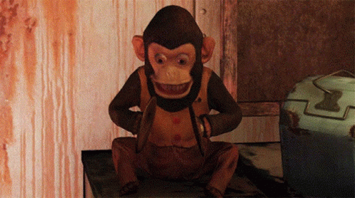 Creepy cymbal-banging monkey toy from Fallout, with glowing eyes, sitting on a table.