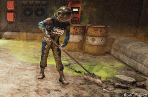 A character in a hazmat suit sweeps toxic waste in Fallout 76, likely during the Radiation Rumble event.