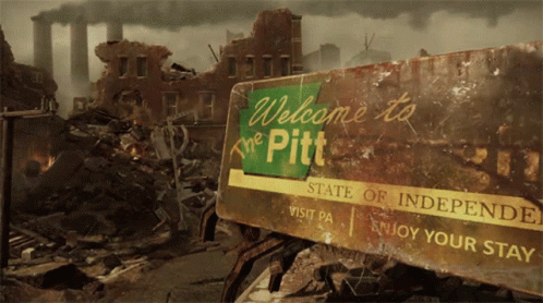 Welcome to The Pitt in Fallout 76, showcasing the iconic post-apocalyptic sign and ruins.