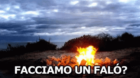 A cozy bonfire burns on a beach at dusk, with the Italian question 'Shall we make a bonfire?' displayed.