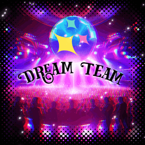 A vibrant graphic poster for 'Dream Team' featuring a sparkling disco ball, bright stars, and a silhouetted crowd.