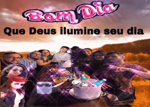 A group of friends or family gathered outdoors, with a 'Good Morning' message in Portuguese.