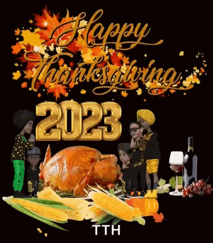 A vibrant Happy Thanksgiving 2023 greeting card featuring a roasted turkey, corn, wine, and stylized family figures.
