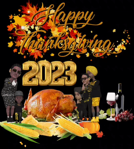 A vibrant Happy Thanksgiving 2023 poster featuring a family, roasted turkey, corn, and autumn leaves.