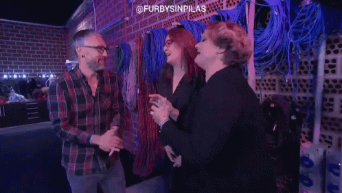 Three people, possibly a family, react with exaggerated surprise and laughter, exclaiming 'AAAAAH!'