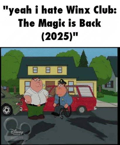 a cartoon of peter griffin and a police officer with the caption " yeah i hate winx club the magic is back 2025 "