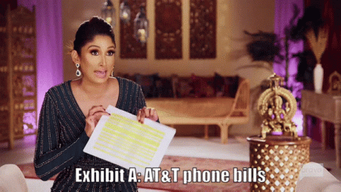 Anisha Ramakrishna from Family Karma presents 'Exhibit A: AT&T phone bills' as evidence.
