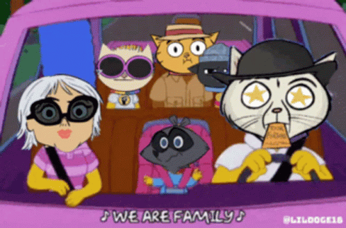 The Stonercatstv family, including cats and a raccoon, enjoying a car ride and singing 'We Are Family'.