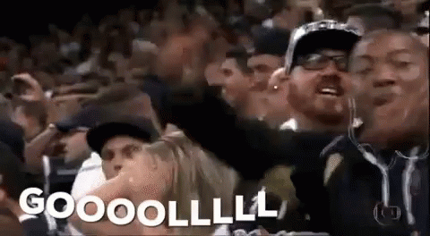 A passionate Corinthians fan celebrates a goal with an enthusiastic 'GOOOOLLLLLL' cheer in a stadium.