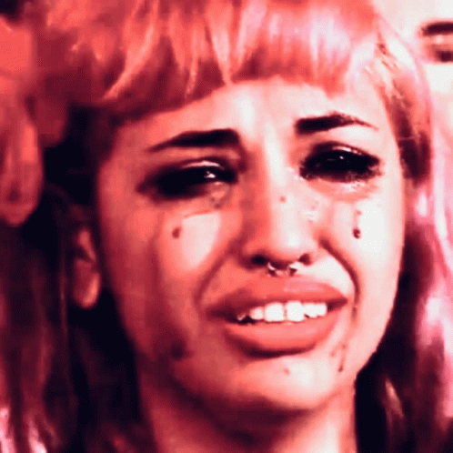 A woman with a nose ring cries, tears and red liquid stream down her face, which then distorts.