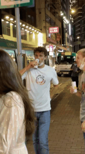 Jort doing a fancy headshake while drinking from a cup on a street in Hong Kong.