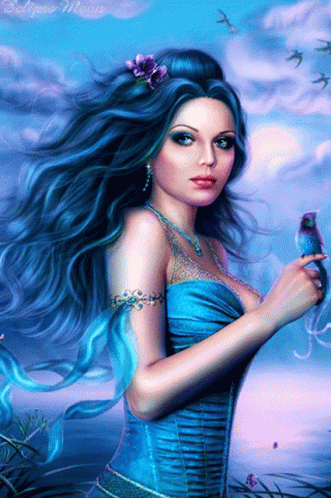 A beautiful fantasy painting of a blue-haired fairy in a blue dress, holding a small bird.