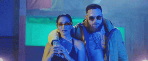 Colombian singer Farina with Miky Woodz, posing together in a vibrant blue-lit music video scene.