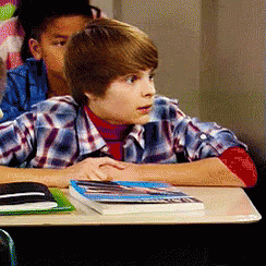 Farkle Minkus from Girl Meets World looking concerned in class, saying 'I don't know what to do now'.