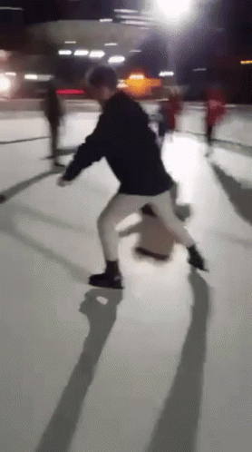 A person ice skating at night loses balance and falls on the rink, captured in a moment of unexpected mishap.